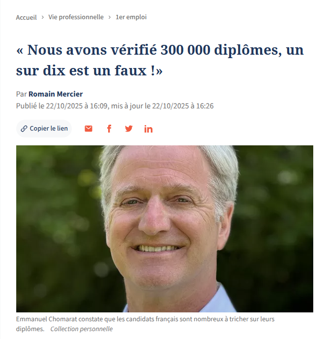 Téléchargez le pdfVerifdiploma a été interviewé par Le Figaro Étudiant : Emmanuel Chomarat, Président Fondateur, alerte que, avec l’IA, fabriquer un faux diplôme est devenu plus simple que jamais, et les recruteurs risquent de recevoir des dossiers parfaitement falsifiés.